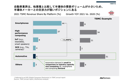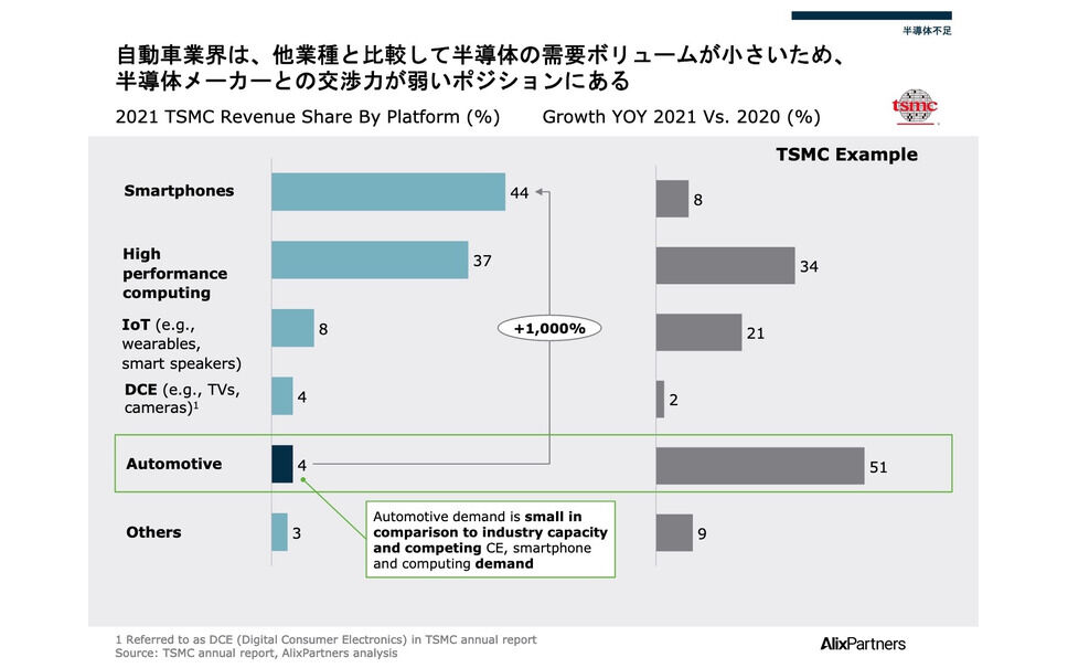 https://www.alixpartners.com/media-center/press-releases/2022-alixpartners-global-automotive-outlook/アリックスによると、自動車業界は、他業種と比較して半導体の需要ボリュームが小さいため、半導体メーカーとの交渉力が弱いそうだ。例えば、世界最大規模の半導体メーカー、台湾積体電路製造(TSMC)の、収益ベースの世界シェアは、2021年にスマートフォン向けが44%、自動車向けが4%となっている。