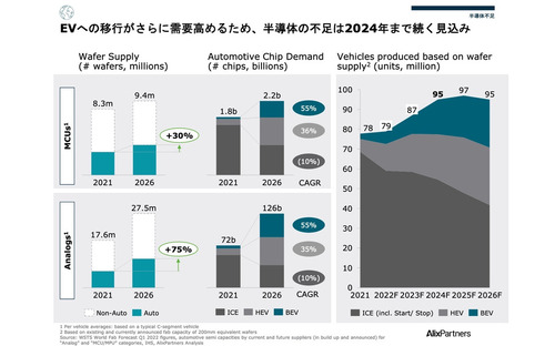 アリックスによると、自動車業界ではEVの普及が半導体の需要をさらに高めるので、半導体の不足は2024年まで続く見込みだという。