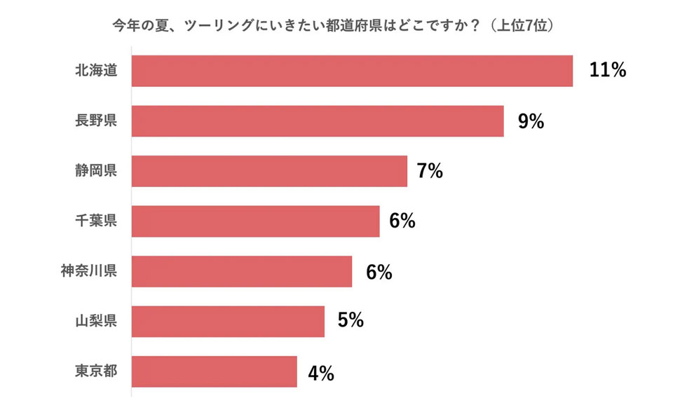 4位に「千葉県」「神奈川県」(いずれも6%)、「山梨県」(5%)、「東京都」(4%)と続いた。この結果について、akippaは「信号が少なく広大な土地が広がる北海道はライダーの聖地とも呼ばれており、人気があるようだ。また上位7都道府県は全て東日本という結果になっており、西日本より東日本にツーリングに行く人が多いことがうかがえた」としている。