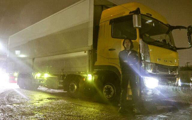 神奈川県川崎市に事業所がある運送企業「大賀運輸」(本社・東京都世田谷区)でトラックドライバーをしている伊藤健次さん(40)。普段は昼間、大型車でルート配送を担当しているが、時折ピンチヒッターとして中長距離も走る。
