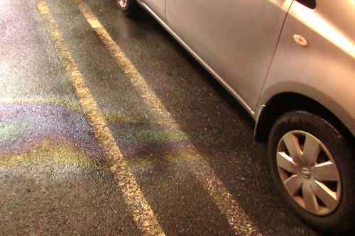 エンジンやミッションから漏れ出た(垂れた)オイルが、地面で虹色に輝いている状態を見たことはないだろうか? 逆の言い方をすれば、停めておいたクルマを移動したらその後にシミができていて、それが虹色に輝いて見えた、ということである。