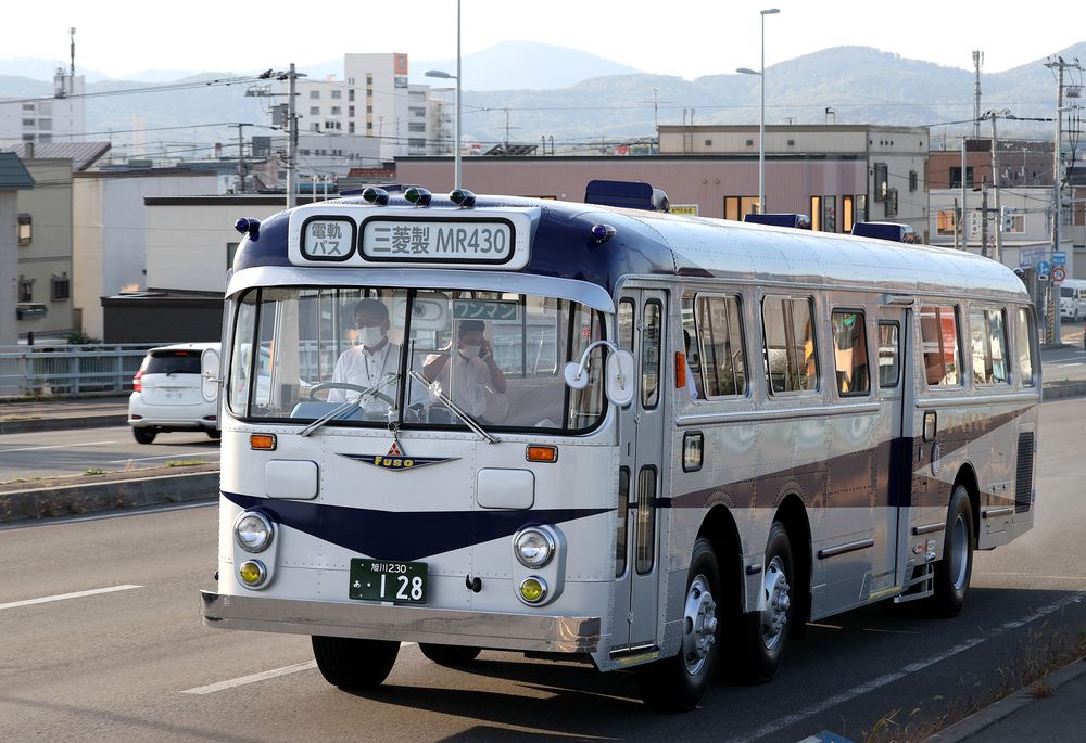 よみがえったのは国内外で唯一、前輪2軸で後部エンジン型のバスとされる三菱ふそうMR430。全長約12メートルと長く、定員110人は一般的なバスより5割ほど多い。高度経済成長期に通勤通学の大量輸送に応えるため、旭川電気軌道が旭川で走らせた3台のうちの1台。小回りが苦手で78年に姿を消していた。