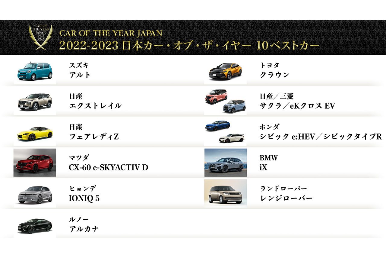 選出された『10ベストカー』は、スズキ・アルト、トヨタ・クラウン、ニッサン・エクストレイル、ニッサン・サクラ/三菱eKクロスEV、ニッサン・フェアレディZ、ホンダ・シビックe:HEV/シビックタイプR、マツダCX-60 e-SKYACTIVR、BMW iX、ヒョンデ IONIQ5、ランドローバー・レンジローバー、ルノー・アルカナ。