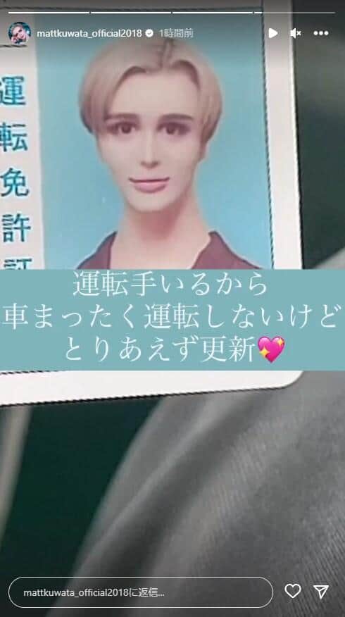 プロ野球・巨人の桑田真澄1軍投手チーフコーチの次男でタレントのMattさんが2022年11月17日、インスタグラムのストーリーズで運転免許証の写真を公開した。