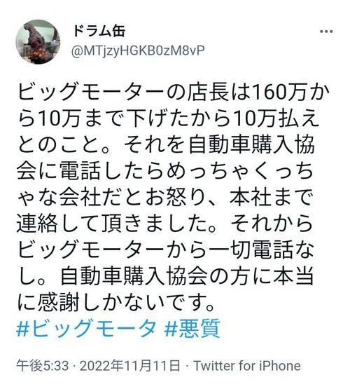 ビッグモーターの店長は160万から10万まで下げたから10万払えとのこと。それを自動車購入協会に電話したらめっちゃくっちゃな会社だとお怒り、本社まで連絡して頂きました。