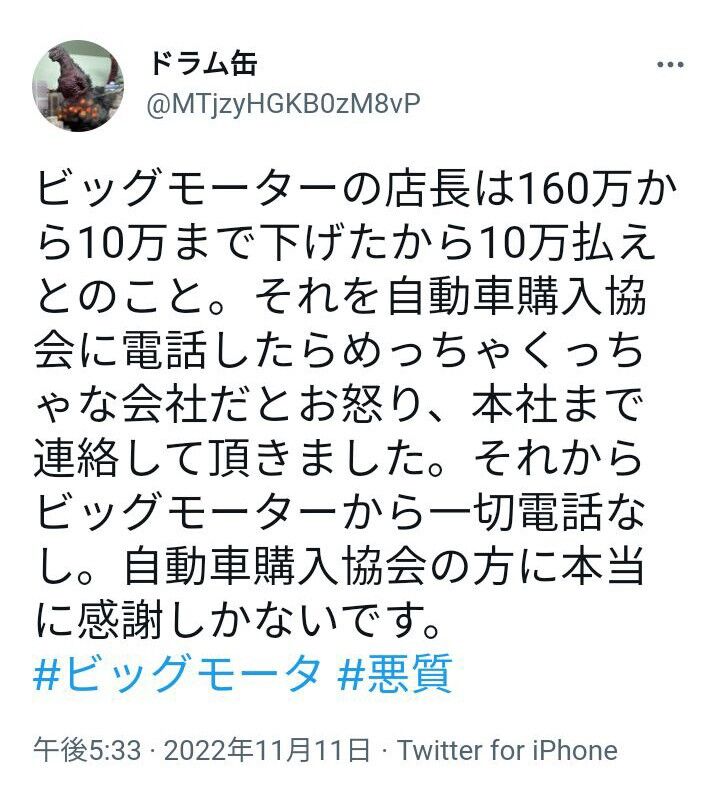 ビッグモーターの店長は160万から10万まで下げたから10万払えとのこと。それを自動車購入協会に電話したらめっちゃくっちゃな会社だとお怒り、本社まで連絡して頂きました。それからビッグモーターから一切電話なし。自動車購入協会の方に本当に感謝しかないです。