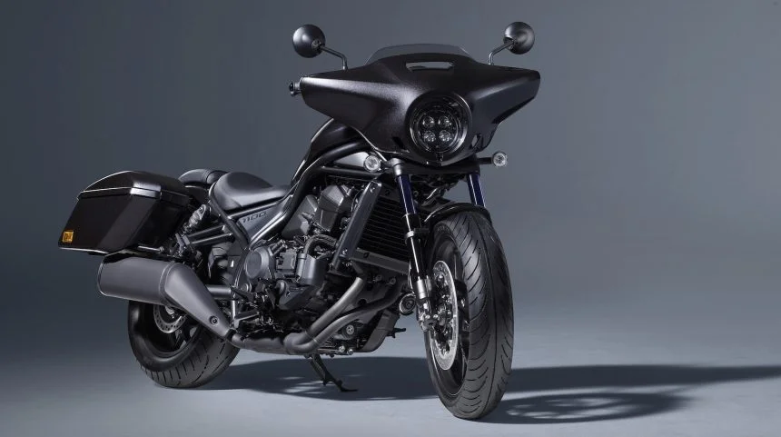 Rebel 1100 T、Rebel 1100 T Dual Clutch Transmissionは、長距離走行時の快適性に配慮し、ライダーへの走行風をやわらげる大型フロントカウルを採用したほか、積載時の利便性を高めるサドルバッグを車体後部の両側(容量:右側16L、左側19L)に標準装備。スタイリッシュなデザインと利便性を兼ね備えた専用装備により、快適なロングツーリングに対応したモデルとしている。カラーリングは、クールでスポーティーな印象が際立つ「ガンメタルブラックメタリック」1色を設定。