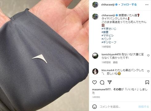 小さな金属片で愛車のバイクがパンクしたことを明かし、「このまま高速走ってたら死んでたやん!!」と肝を冷やしたことを伝えました。