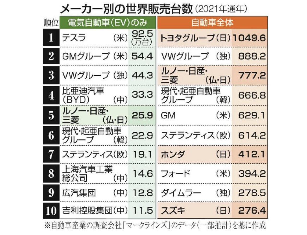 自動車産業の調査会社「マークラインズ」(東京)のデータを基に、22年上半期のメーカー別のEV販売台数を本紙が集計したところ、テスラが首位で55万台超。2位は中国EV大手の比亜迪(BYD)の30万台超で、米ゼネラル・モーターズ(GM)や独フォルクスワーゲン(VW)がそれぞれ20万台超で続いた。日本勢は3社連合の6位が最上位で13万台超だった。