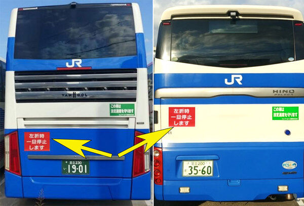 たとえば2022年12月から、ジェイアールバス関東が車体後部に「左折時 一旦停止します」との注意喚起ステッカーを取り付けました。なお、ジェイアールバス東北は前年から同様の取り組みを実施しており、ステッカーは同じものが採用されています。