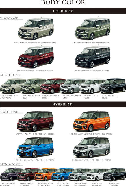 ボディーカラーは「キャラバンアイボリーメタリック」「タフカーキパールメタリック」を新規採用。そのうえでソリオ ハイブリッドSZにはガンメタリックのツートーンルーフを設定し、モノトーン6タイプ、ツートーン5タイプの全11タイプ展開に。…