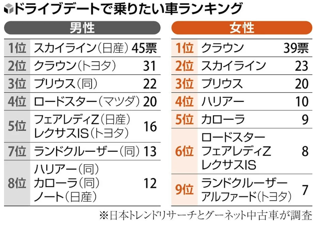 ドライブデートで乗りたい車として最も人気が高かったのは、男性が日産自動車のスカイライン、女性がトヨタ自動車のクラウンだった。