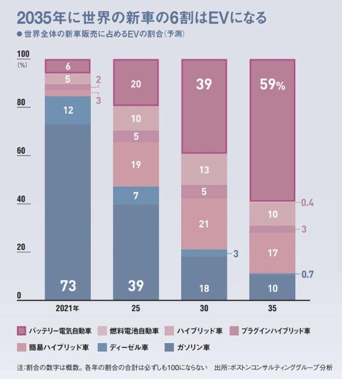 日本市場の予測は公表していませんが、トレンドとしてはEVが間違いなく普及していくと見ています。現時点での「発射台」が低いので30年段階では後れを取るでしょうが、35年にかけて米国に近い水準まで大きく加速してもおかしくありません。
