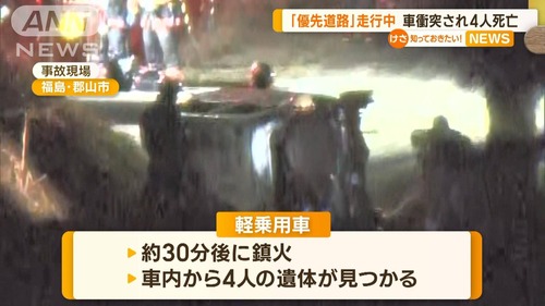 福島県郡山市大平町の市道交差点で乗用車と軽乗用車が衝突し、炎上した軽自動車に乗っていた4人が死亡した事故で、4人は郡山市内に住んでいる家族とみられる。3日、関係者への取材で分かった。