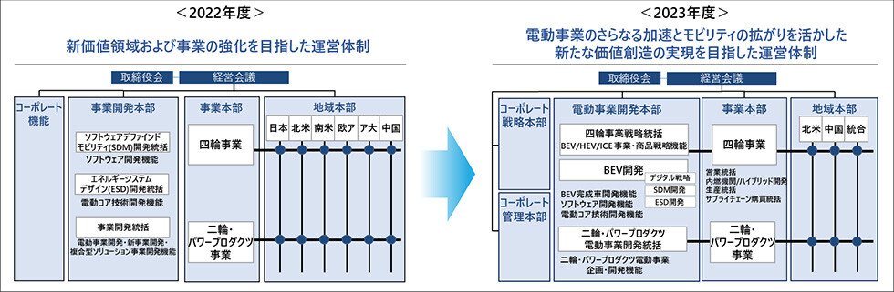 組織変更では、電動領域の戦略および開発機能を集約し電動事業のさらなる強化・加速を図る電動事業開発本部の新設。6地域本部を「北米」「中国」「統合」の3地域本部に集約し、統合地域本部は、日本地域、アジア・大洋州地域、南米地域、欧州・アフリカ中東地域の4つの地域を束ねる本部として新設。また、新たな価値創造に向けた企業戦略の策定、実行、発信機能の取組みを強化するためのコーポレート戦略本部およびコーポレート管理本部を新設。企業戦略と連動した経営資源の全体最適化を図る。