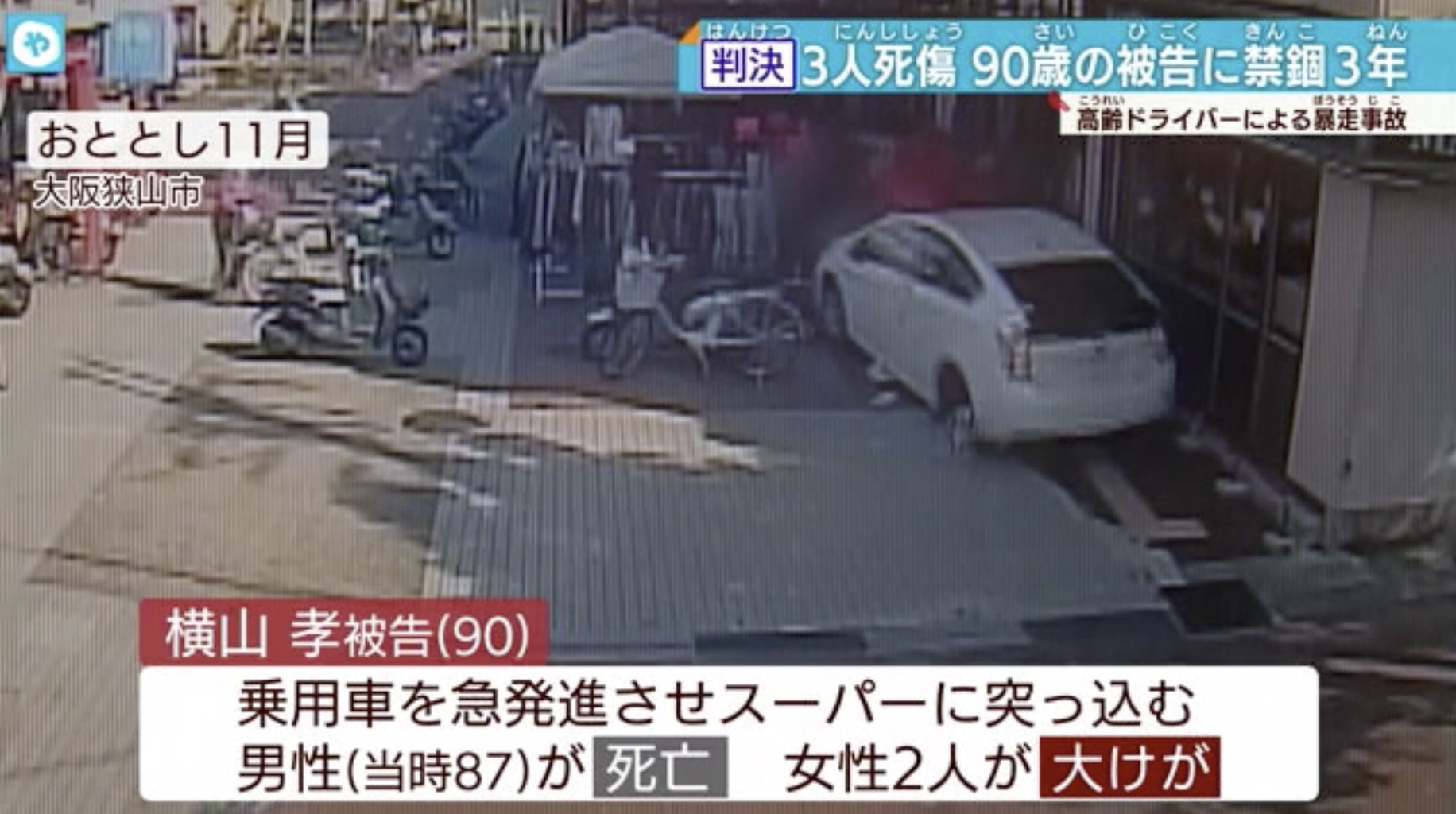 横山被告は警察の調べに対し、「慌ててブレーキとアクセルを踏み間違えた」と供述。大阪地裁堺支部は27日の判決で「致命的な誤りで過失の程度は相当大きい。刑事責任が重く、実刑はやむを得ない」とした上で「罪を認め反省を続けると述べている」として禁固3年を言い渡しました。