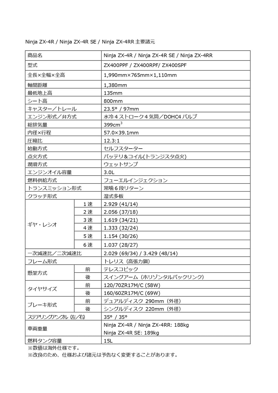 ■Ninja ZX-4R / Ninja ZX-4R SE / Ninja ZX-4RR 主要諸元