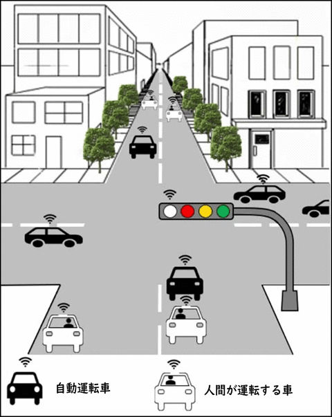 つまり信号機の白は「前にならえ」という意味だ。人間のドライバーは前の車が進めば進み、止まれば止まる。こうするだけで自動運転車が作り出す、スムーズな流れに乗ることができる。
