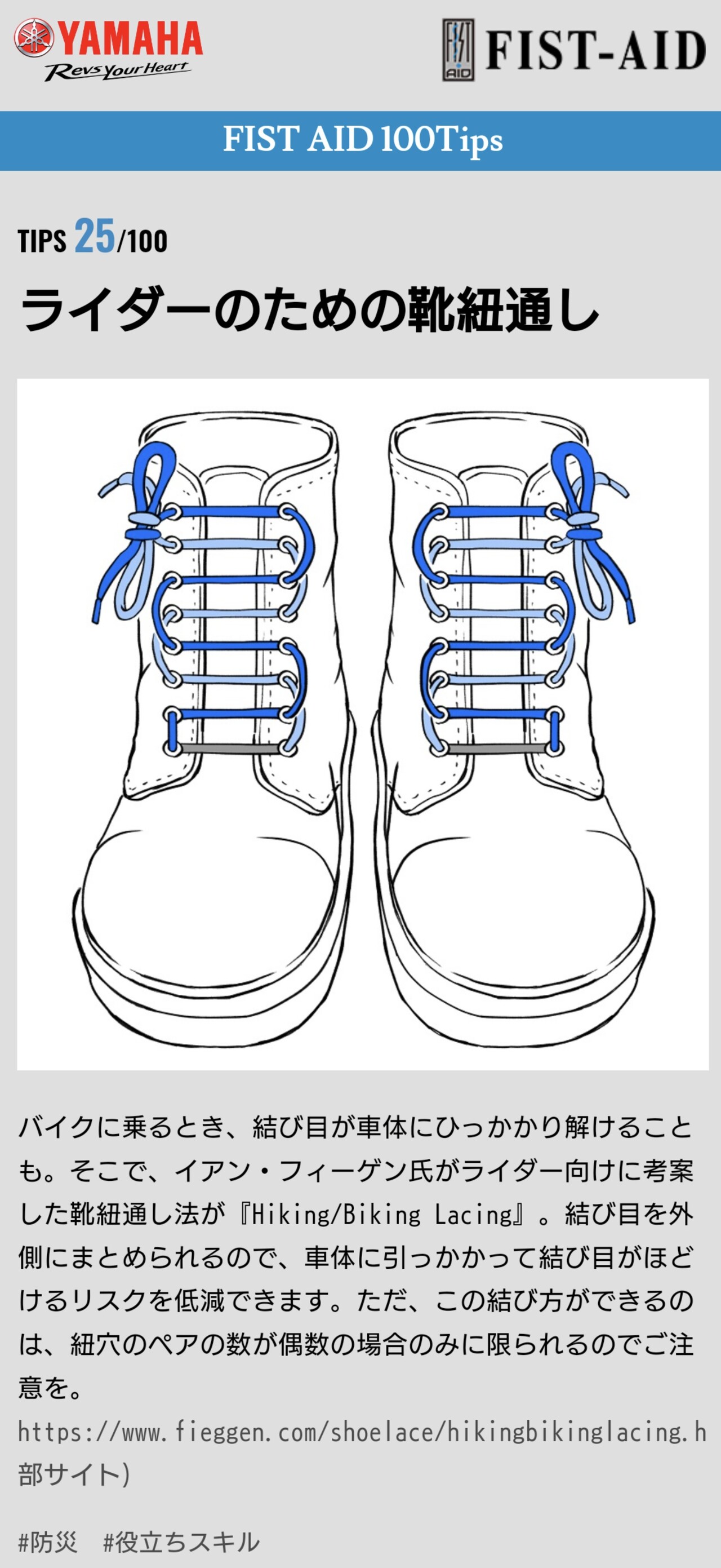 ヤマハのHPにめっちゃ有益な情報乗ってるんだけど……これ、バイクに乗っててステップに靴紐引っ掛けるのも防げるし、自転車のチェーンに巻き込むのも防げる