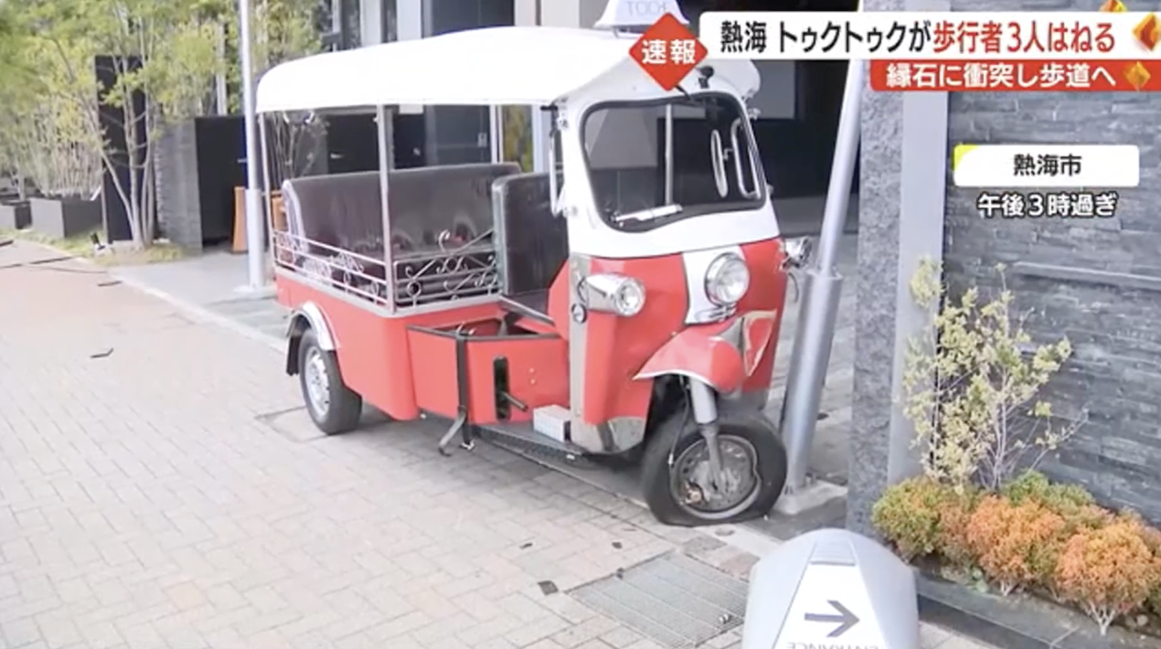 15日午後2時半頃 熱海市東海岸町の国道135号線で、三輪自動車の「トゥクトゥク」が縁石に衝突し その後歩道に乗り上げ歩行者3人をはねました。