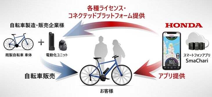 ホンダは今後、スマチャリのアプリをユーザーに提供するとともに、同システムを搭載する自転車を製造・販売する企業に対しては、電動アシストユニットの制御ソフトウエアに関する技術をはじめとする各種ライセンス、ならびにサービスを運用・管理するコネクテッドプラットフォームを有償で提供する。