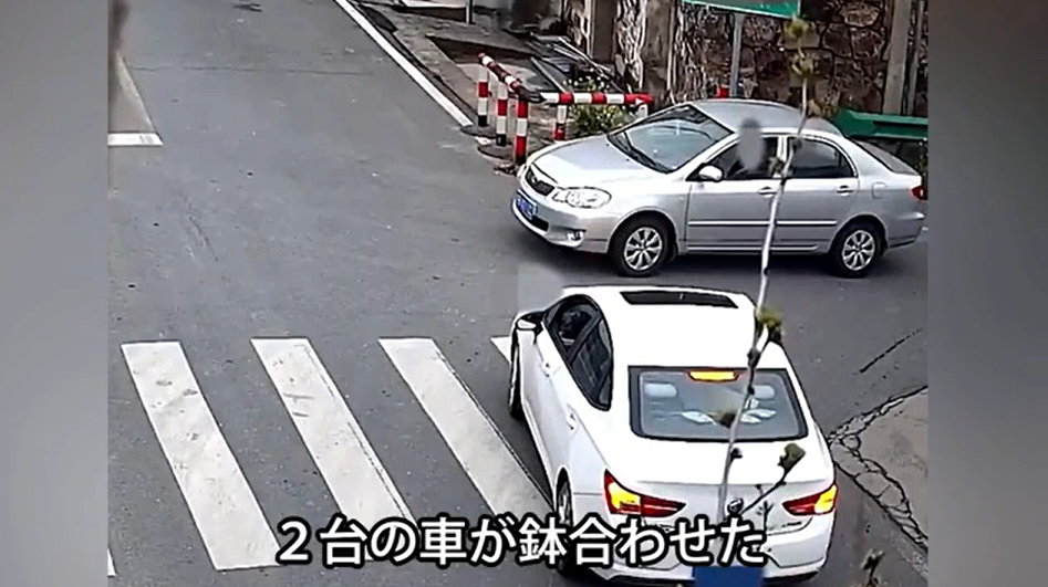 中国東部の江蘇省にある村の交差点で2台の車が鉢合わせた。