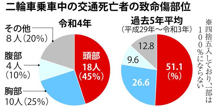 警視庁の分析では、令和4年の二輪乗車中の交通死亡者(40人)の致命傷部位は「頭部」(18人、45%)に次いで「胸部」(10人、25%)が多かったという。