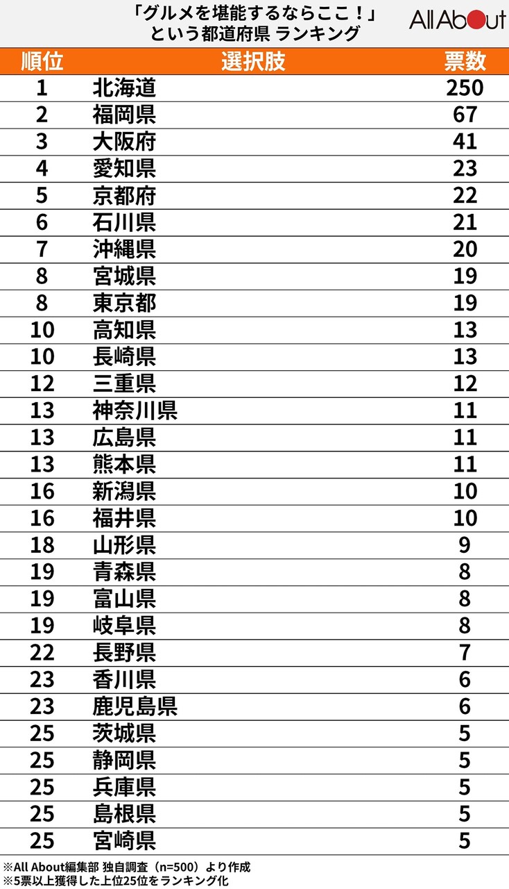 第3位は「大阪府」でした。大阪名物のたこ焼きやお好み焼き、串カツなど、多くのご当地グルメが楽しめます。回答者からは「有名店が多い。特に自由軒のカレーや、551の肉まんなどは美味しかった(千葉県/10代男性)」「お好み焼き、たこ焼き、串揚げなど美味しいものが沢山あります(神奈川県/50代男性)」などのコメントが寄せられました。