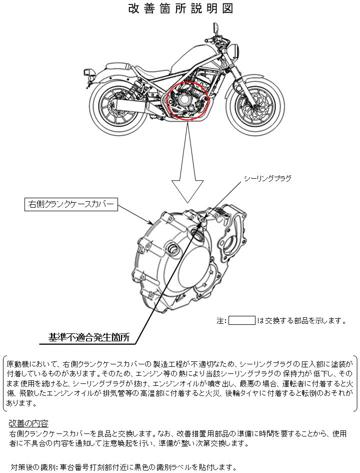 原動機において、右側クランクケースカバーの製造工程が不適切なため、シーリングプラグの圧入部に塗装が付着しているものがあります。そのため、エンジン等の熱により当該シーリングプラグの保持力が低下し、そのまま使用を続けると、シーリングプラグが抜け、エンジンオイルが噴き出し、最悪の場合、運転者に付着すると火傷、飛散したエンジンオイルが排気管等の高温部に付着すると火災、後輪タイヤに付着すると転倒のおそれがあります。