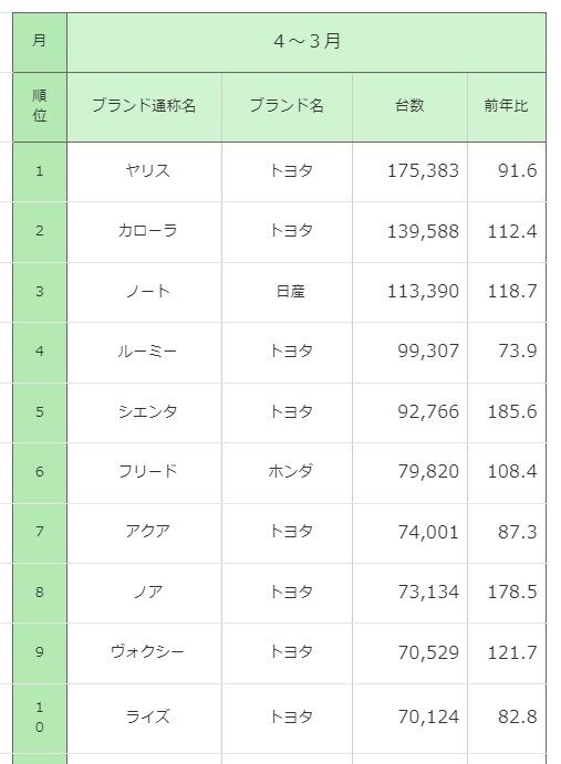 乗用車部門の販売台数1位はトヨタの「ヤリス」(17万5383台)だった。2位はトヨタの「カローラ」で13万9588台、