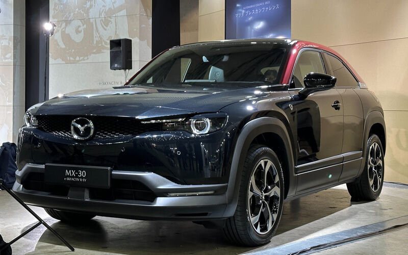 マツダは14日、発電用のロータリーエンジン(RE)を搭載した小型スポーツ用多目的車(SUV)「MX―30」のプラグインハイブリッド車(PHV)を日本で初めて公開した。市販車にREを搭載するのは11年ぶりだ。欧州に続き、日本でも近く発売を予定する。MX―30は、REで発電した電気を使い、モーターで走る。航続距離は充電分だけだと約85キロ・メートルだが、バッテリーや燃料タンクも搭載し、REと組み合わせると、計算上は600キロ・メートル以上走行できる。既に予約受け付けを始めた欧州では、ドイツで3万5990ユーロ(約530万円)で販売している。