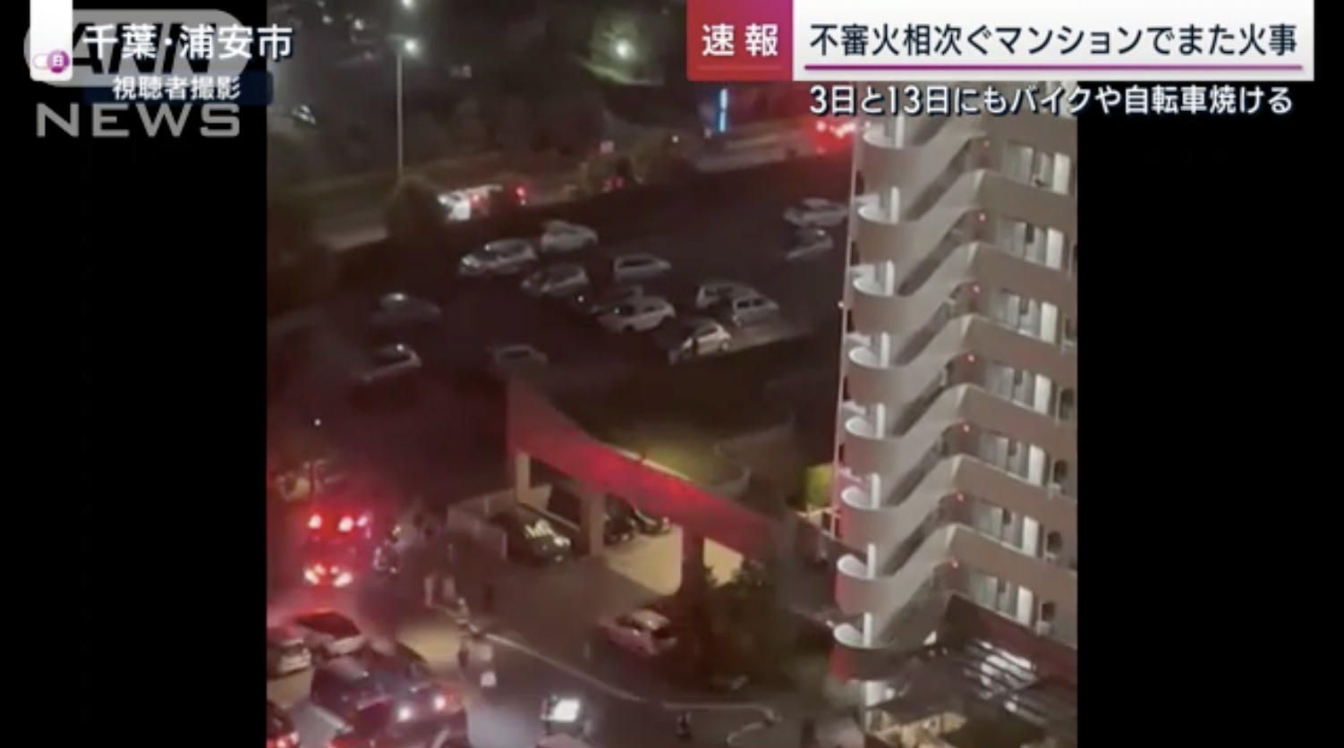 千葉・浦安のマンション駐輪場で火事が発生しバイク1台が焼ける、周辺では3日と13日にも発生