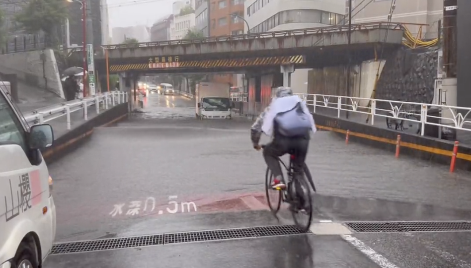 代々木の高架下、タクシーと配送の方が停まってたから気付けたけど、この大雨で冠水通行止め。