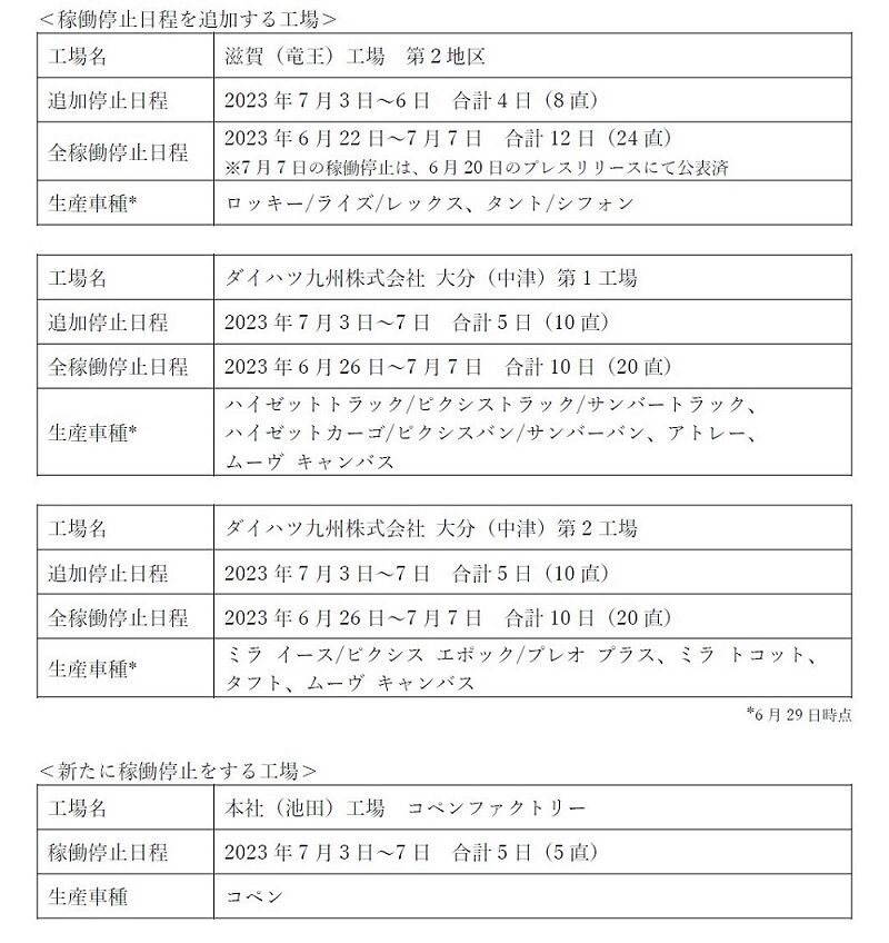 追加の生産停止期間は、滋賀(竜王)工場の第2地区が2023年7月3~6日(4日間)、ダイハツ九州大分(中津)第1工場と同第2工場は同年7月3~7日(5日間)である。