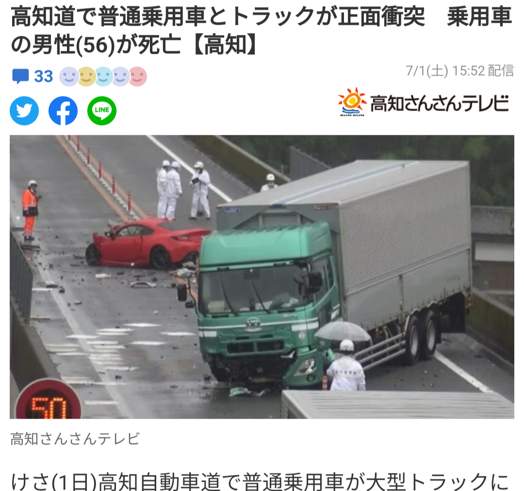 高知道で普通乗用車とトラックが正面衝突 乗用車の男性(56)が死亡【高知】https://news.yahoo.co.jp/articles/55efbfae2e286954dbd8dd04b511ac6af4759bf4