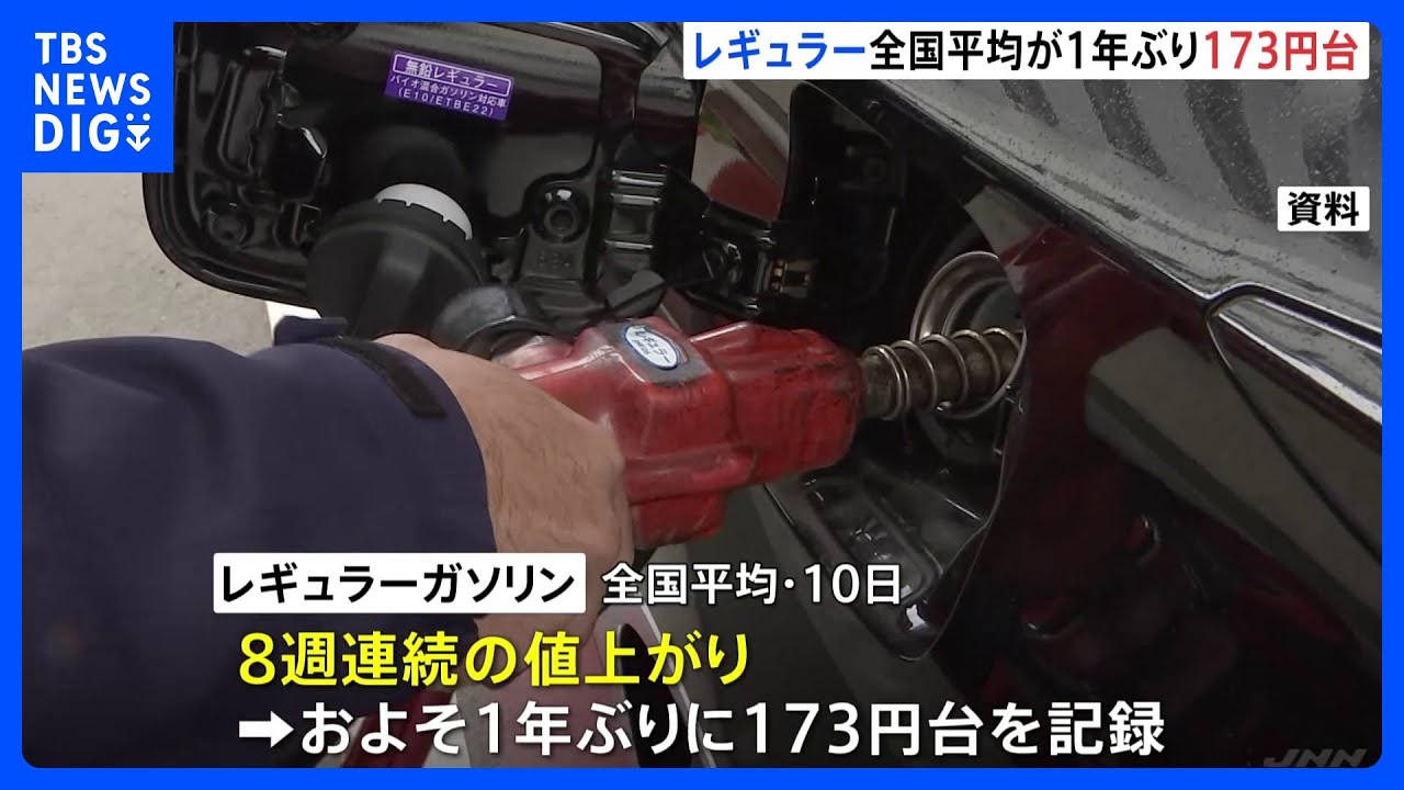 レギュラーガソリンの全国平均価格が、およそ1年ぶりに173円台となりました。政府の補助金が段階的に減っていて、8週連続で値上がりしています。