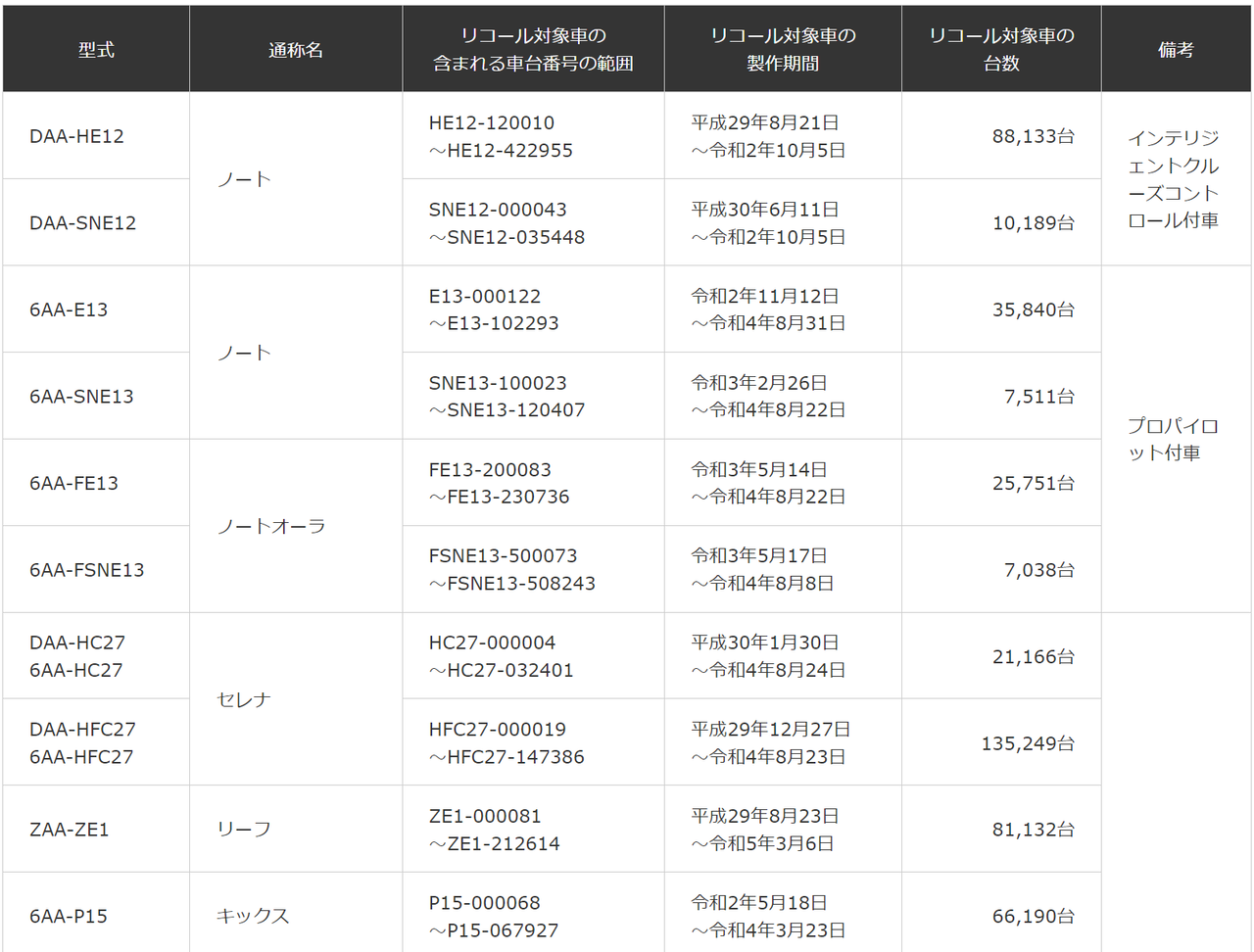 対象は「ノート」「セレナ」「ノートオーラ」「リーフ」「キックス」の計5車種で延べ109万5458台