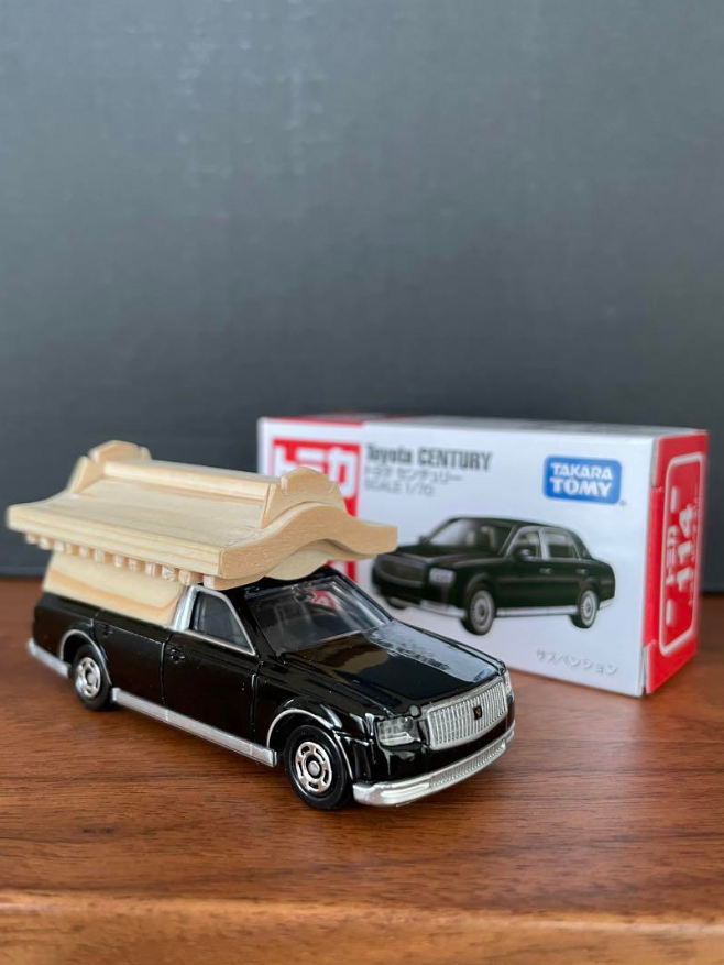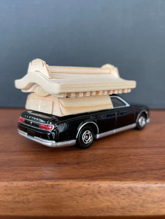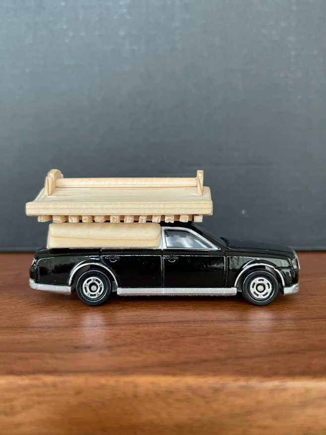 新品 トミカ 114 トヨタ センチュリー 霊柩車 宮型 改造 オリジナル スペシャル 木製 無垢 屋根付 ミニカー新品の改造トミカです。屋根はかなり拘り本物と同じように組んでいます。1枚の板から全て削り出し部品点数40個にもなります。追加部分は全て無垢の木です。