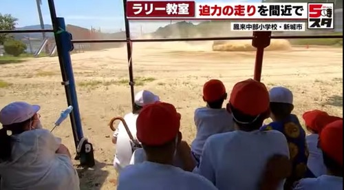新城市の小学校の校庭を砂ぼこりを巻き上げながら疾走しているのは、なんと、ラリーカー。新城市の鳳来中部小学校で行われたのは、プロのラリードライバーによる特別授業です。