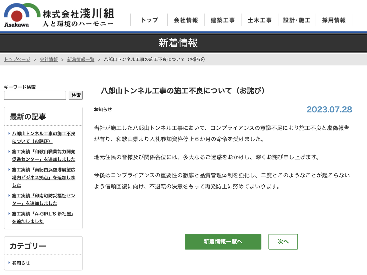 和歌山県は27日、那智勝浦町で、去年9月に工事が完了した「八郎山トンネル」について、覆工コンクリートに空洞が存在し、厚さが不足している施工不良が発生していたことを明らかにしました。