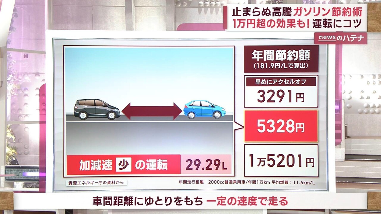 続いて、「5,328円」節約できるのは“加減速の少ない運転”。車間距離にゆとりをもって一定速度で走ることによって、年間で30リットル近くの省エネができて節約につながるということです。