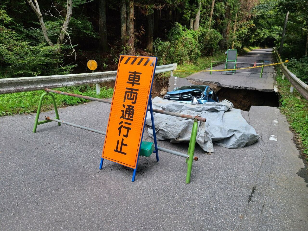 21日未明、愛知県設楽町で国道が陥没し、軽乗用車が転落しました。乗っていた大学生の男女3人が病院に運ばれました。