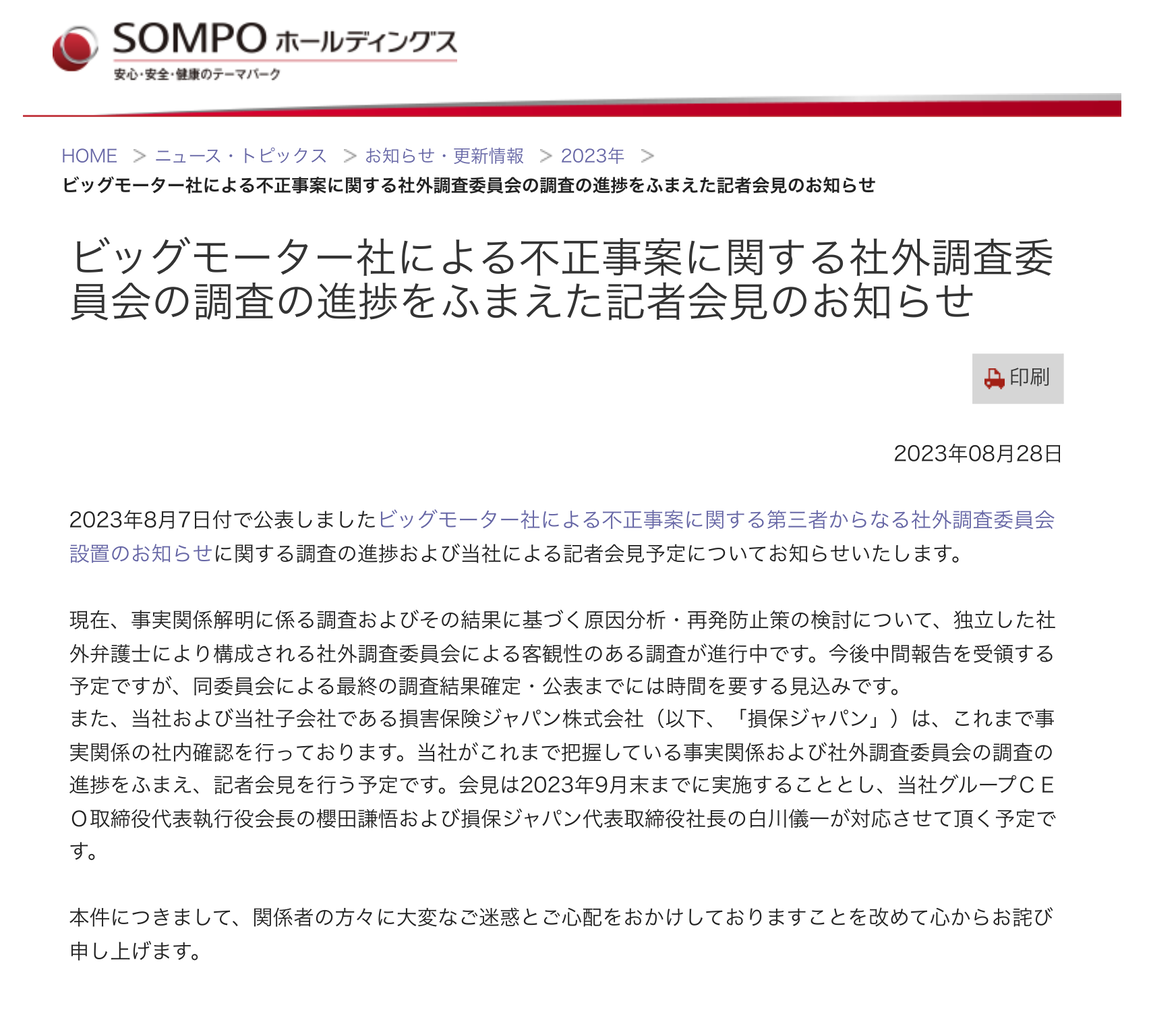 SOMPOホールディングス、ビッグモーター問題で9月末までに記者会見を実施すると発表 2023/8/29 バイク速報 損害保険ジャパンを傘下に持つSOMPOホールディングスは28日、中古車販売大手ビッグモーター(東京)による自動車保険の保険金不正請求問題を受け、9月末までに損保ジャパン社長らが記者会見を開くと発表した。 https://www.47news.jp/9783577.html 続きを読む Source: バイク速報