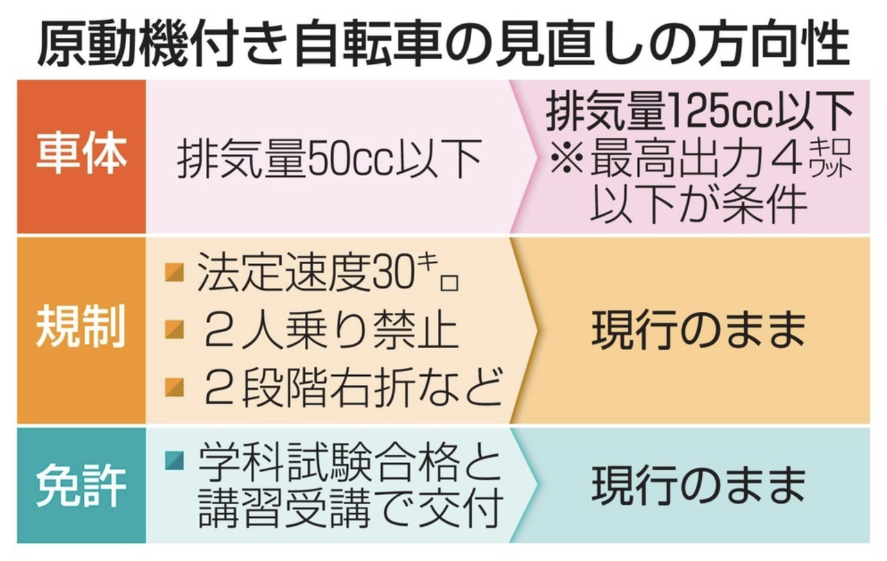 125cc以下の車体には、最高出力をミニバイクと同程度の4キロワット以下に制御する装置の設置を義務付ける方向で議論。法定速度30キロや2人乗り禁止、2段階右折といった現行の規制や、学科試験合格と講習受講で交付される免許制度は変更しない方針という。