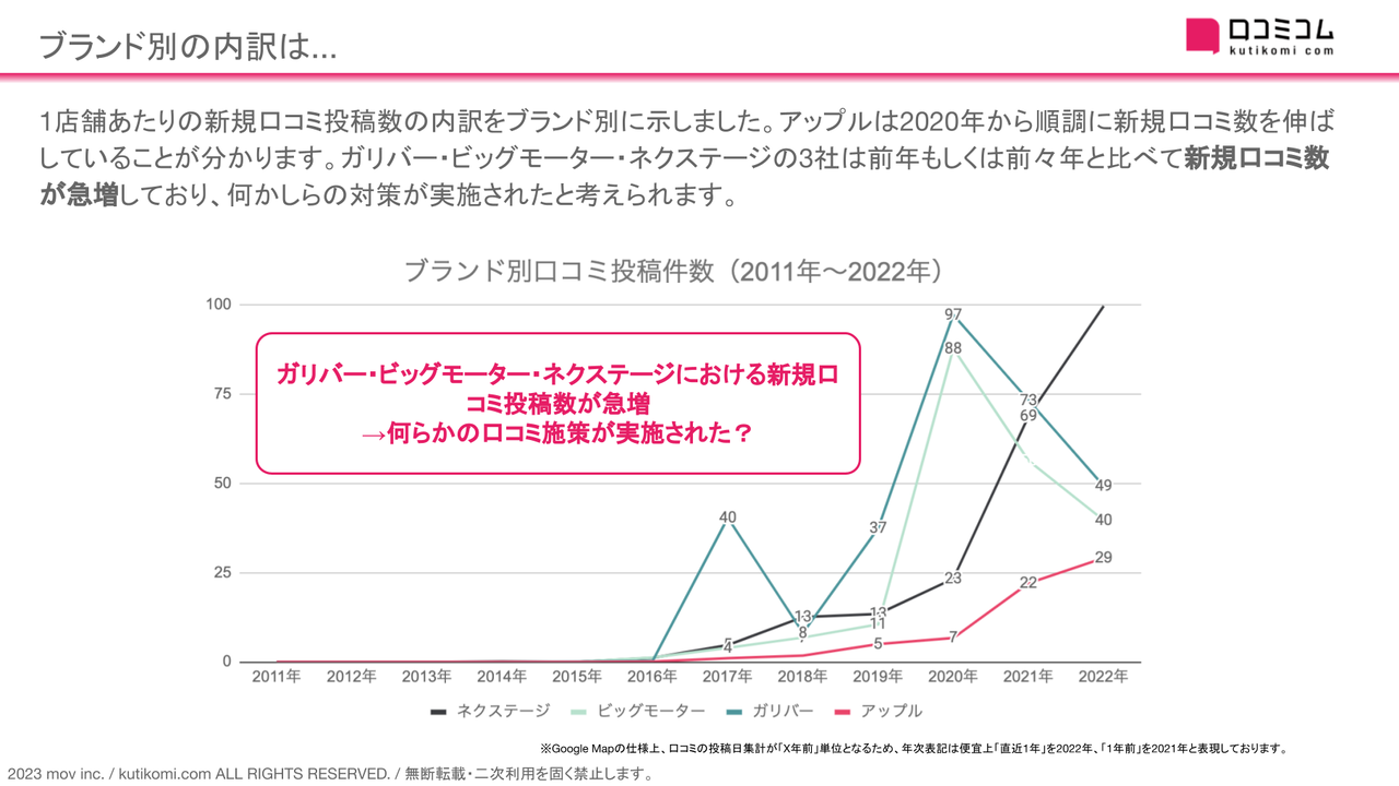 アップルは2020年から順調に新規口コミ数を伸ばしていることが分かります。