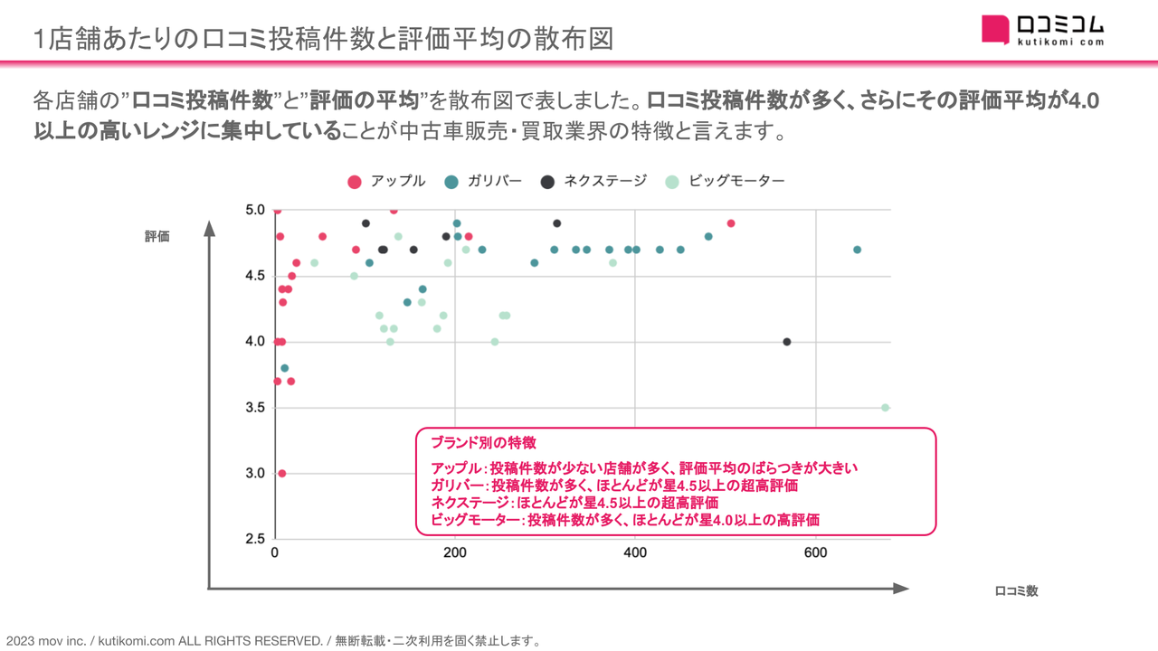 ガリバー・ビッグモーター・ネクステージの3社は前年もしくは前々年と比べて新規口コミ数が急増しており、何かしらの対策が実施されたと考えられます。