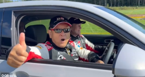 運転席に座る豊田会長に対し、「コレ何のクルマですか?」と問いかけると、会長は元気よく「ホンダです!」と回答。