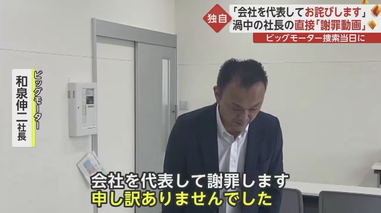 FNNが独自に入手した映像には、先週15日にビッグモーターの和泉社長が関東地方の店舗を訪れ、初めて顔を合わす社員らに頭を下げ、直接謝罪する様子が映っていた。