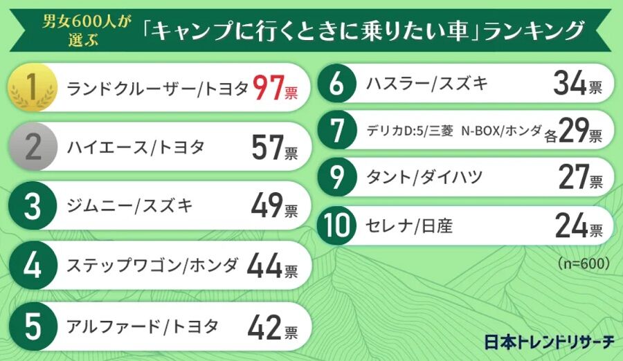 近年、ブームが続いているキャンプ。全国の男女に「キャンプに行くときに乗りたいクルマ」を聞くと、トップはトヨタ自動車「ランドクルーザー」(16.2%)であることが、日本トレンドリサーチとグーネット中古車の調査で分かった。2位はトヨタ自動車「ハイエース」(9.5%)。以下、スズキ「ジムニー」(8.1%)、ホンダ「ステップワゴン」(7.3%)、トヨタ自動車「アルファード」(7.0%)と続いた。