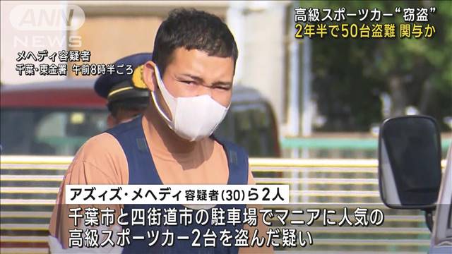 アフガニスタン国籍のアズィズ・メヘディ容疑者(30)ら2人は4月、仲間と共謀し、千葉市などの駐車場でマニアに人気の高級スポーツカー2台を盗んだ疑いが持たれています。